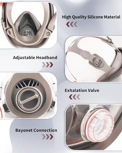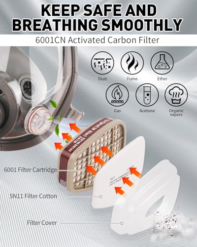 Full Face Mask: The gas cover is designed with full face anti-fog and anti-scratch screen shield, providing you great and clear visibility. The respirator mask forms a tight seal your face and protects you from dust and insulation particulates