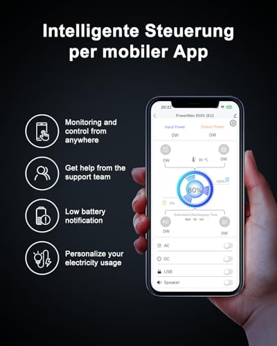 [2200W Fast Charging] 0-100% in 1.44h with 2200W AC input and 2400W solar input. Powermax 6000 uses a 2200W bi-directional inverter, you will get a fast charging speed while using AC charging cable.The capacity from 0% to 100% can be completed within 1.96 hour.