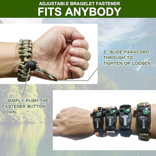 Paracord Survival Bracelet-Length Adjustable,Loud Whistle Emergency Compass Survival Fire Starter Scraper Accessories for Hiking and Camping and Hunting 4-Pack(Muti-Color)
