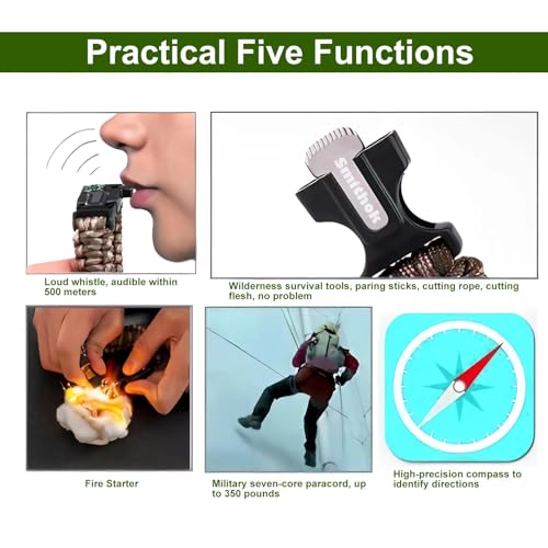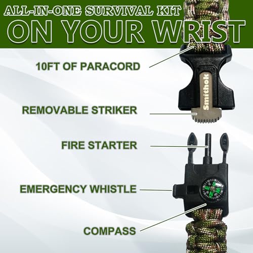 【5 in 1 Survival Bracelet】 Smithok all-inclusive survival bracelets offer a range of survival gear, including a reliable and accurate compass, a fire starter, a 11 feet of military-grade paracord, and a whistle. Perfect for traveling, the tactical bracelet is lightweight and adjusts to fit the wrist perfectly.